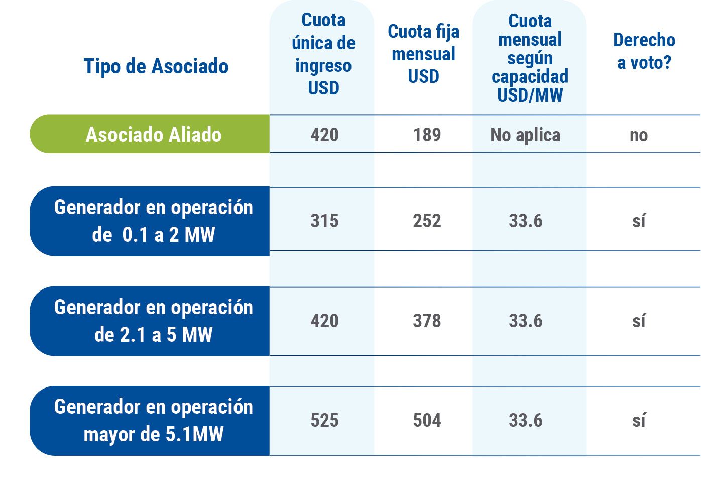 na vez aceptada la solicitud de ingreso por parte de la Junta Directiva de la Asociación, el postulante deberá cancelar una cuota única de ingreso y la cuota trimestral correspondiente. Estos montos se calcularan dependiendo del tipo de socio y de la capacidad de generación del proyecto.